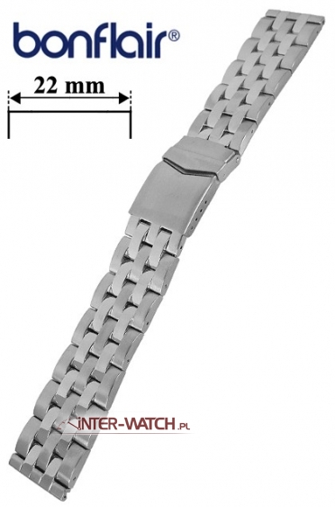 Bransoleta Bonflair do zegarka, kuta solidna bransoleta do męskiego zegarka wykonana ze stali. Klasyczna bransoleta do zegarka szerokości 22,0 mm przy kopercie. Zamek standardowy z dodatkowym zabezpieczeniem, bransoleta ozdobnie polerowana i matowana na całej długości, pełne ogniwa, boczne powierzchnie ogniw jednolite, możliwa regulacja długości bransolety poprzez regulację zamka lub skracanie.