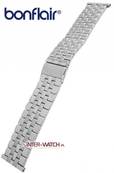 Szeroka bransoleta do zegarka Bonflair, standardowa i solidna bransoleta do zegarka wykonana ze stali. Klasyczna bransoleta do zegarka szerokości 28,0 mm przy kopercie. Bransoletę można dopasować - zwężać do szerokości 24,00 mm. Zamek standardowy z dodatkowym zabezpieczeniem, pełne ogniwa bransolety, bransoleta ozdobnie polerowana i matowana na całej długości, możliwa regulacja długości bransolety.