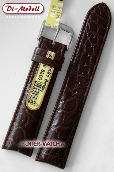 Pasek Di-Modell Krokodyl Bentley 3035.2820 szerokości 20 mm przy kopercie, kolor No.28 - Ciemny brąz. Luksusowy pasek do zegarka, pasek Di-Modell Krokodyl Bentley z ekskluzywnej kolekcji Noble House. Antyalergiczny pasek do zegarka wykonany ręcznie z prawdziwej skóry Krokodyla. Do wykonania tego paska do zegarka wykorzystano specjalnie selekcjonowaną skórę Krokodyla. Zastosowany patentowy system Areo-Futter który zapobiega akumulowaniu się wilgoci wewnątrz paska co przedłuża jego żywotność oraz poprawia komfort użytkowania, oraz patentowe zabezpieczenie przed przesuwanien się szlufki. Pasek do zegarka Di-Modell Krokodyl Bentley jest estetyczny, trwały a jednocześnie miękki i bardzo wygodny w użytkowaniu. Pasek do zegarka przeszywany na całej długości i wykańczany po bokach ozdobnym szwem. Dodatkowo pasek jest specjalnie pogrubiany na 1 / 3 długości. Szerokość paska nieznacznie zwężana na długości przy klamerce do 18 mm. Klamerka stalowa - sygnowana, stalowa lub złocona do wyboru. Pasek Di-Modell Krokodyl Bentley to ekskluzywny i elegancki pasek do zegarka dostępny w długości standardowej L. Prosimy o dokładne sprawdzenie szerokości mocowania paska przy kopercie zegarka oraz długości całkowitej paska. Di-Modell markowe paski do zegarków.