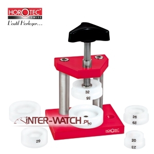 Prasa HOROTEC Mini Press do zamykania kopert zegarków i wciskania szkieł. Równomierny nacisk oraz pionowe prowadzenie gwarantują precyzyjne i bezpieczne wykonywanie czynności zegarmistrzowskich.