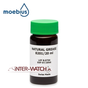 Szwajcarski smar do sprężyn napędowych mechanicznych i automatycznych zegarków naręcznych, smar do dźwigni kalendarzy i dźwigni funkcyjnych w mechanizmach zegarkowych i nie tylko, specjalistyczny smar Moebius 8201 o wysokich parametrach i długiej przydatności do użycia stosowany wszędzie tam gdzie występują ponadnormatywne tarcia w mikromechanizmach różnego typu, dodatek dwusiarczku molibdenu (MoS2) podnosi właściwości ślizgowe smaru, poza zegarmistrzostwem smar Moebius 8201 można stosować w mikromechanice precyzyjnej jak aparaty fotograficzne, maszyny do pisania, drukarki komputerowe, kołowrotki wędkarskie i wszedzie tam gdzie jest potrzebne precyzyjne smarowanie bardzo obciążonych powierzchni ciernych. Smar Moebius 8201 to smar Tikstropowy podobny do smaru Moebius 8200 ale jest bardziej lepki i dłużej trzyma się na powierzchniach. Opakowanie szklane - 15 ml.