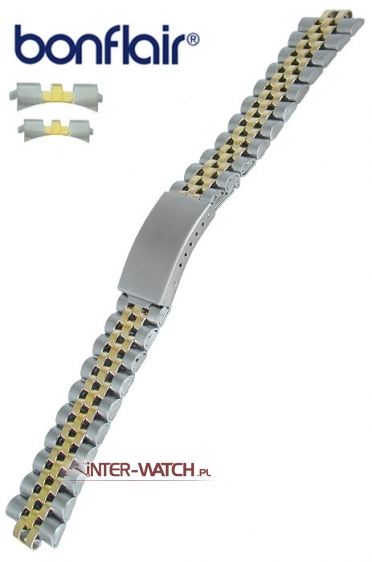 Bransoleta do zegarka BONFLAIR Multiend, uniwersalna bransoleta do zegarka wykonana ze stali. Klasyczna bransoleta do zegarka szerokości 18, 20 lub 22,00 mm przy kopercie. Bransoleta wyposażona w uniwersalne końcówki umożliwjające mocowanie do kopert o różnych kształtach i szerokościach. Bransoletę można dopasować - zwężać do szerokości 18,00 mm. Zamek standardowy, ogniwa bransolety standardowe, bransoleta ozdobnie polerowana i matowana na całej długości dodatkowo częściowo złocona PVD, możliwa regulacja - skracanie lub wydłużanie długości bransolety poprzez regulację zamka oraz usuwanie lub dokładanie ogniw bransolety.