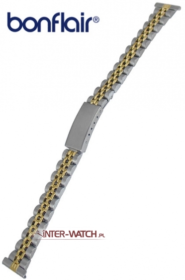 Bransoleta do zegarka 16-12 mm Bonflair, standardowa bransoleta do zegarka damskiego wykonana ze stali. Klasyczna jednoczęściowa bransoleta do zegarka szerokości 16,0 mm przy kopercie. Bransoletę można dopasować - zwężać do szerokości 12,00 mm. Zamek i ogniwa standardowe, bransoleta częściowo złocona PVD oraz ozdobnie matowana i polerowana na całej długości, możliwe skracanie lub wydłużanie bransolety poprzez regulacje zamka oraz montaż lub demontaż ogniw .