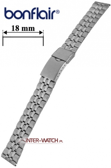 Bransoleta do zegarka 18 mm Bonflair, standardowa bransoleta do męskiego zegarka wykonana ze stali. Klasyczna bransoleta do zegarka szerokości 18,0 mm przy kopercie. Zamek standardowy z zabezpieczeniem, bransoleta polerowana i częściowo matowana na całej długości, możliwa regulacja długości bransolety poprzez regulację zamka lub skracanie.