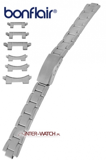 Bransoleta do zegarka Bonflair Multiend, uniwersalna bransoleta do zegarka wykonana ze stali. Klasyczna bransoleta do zegarka szerokości 12, 14 lub 16,00 mm przy kopercie. Bransoleta wyposażona w uniwersalne końcówki umożliwjające mocowanie do kopert o różnych kształtach i szerokościach. Bransoletę można dopasować - zwężać do szerokości 12,00 mm. Zamek standardowy, ogniwa bransolety standardowe, bransoleta ozdobnie matowana na całej długości, możliwa regulacja - skracanie lub wydłużanie długości bransolety poprzez regulację zamka oraz usuwanie lub dokładanie ogniw bransolety.