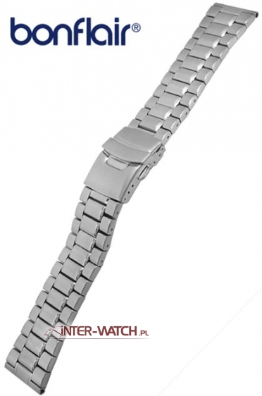Bransoleta do zegarka 22 mm Bonflair, standardowa bransoleta do zegarka męskiego wykonana ze stali 316L. Klasyczna jednoczęściowa bransoleta do zegarka szerokości 22,0 mm przy kopercie. Zamek skrzydełkowy z dodatkowym zabezpieczeniem, bransoleta ozdobnie matowana na całej długości, możliwe skracanie lub wydłużanie bransolety poprzez regulacje zamka oraz usuwanie lub dokładanie ogniw .