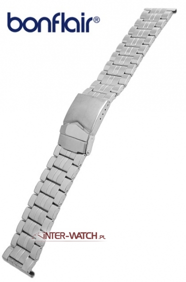 Bransoleta do zegarka 24-21 mm Bonflair, standardowa bransoleta do zegarka wykonana ze stali. Klasyczna bransoleta do zegarka szerokości 24,0 mm przy kopercie. Bransoletę można dopasować - zwężać do szerokości 21,00 mm. Zamek standardowy z dodatkowym zabezpieczeniem, bransoleta ozdobnie polerowana i matowana na całej długości, możliwa regulacja długości bransolety.