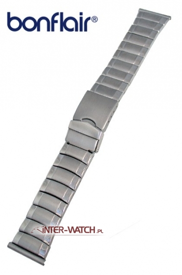 Bransoleta do zegarka Bonflair, standardowa solidna bransoleta do męskiego zegarka wykonana ze stali. Klasyczna bransoleta do zegarka szerokości 22,0 mm przy kopercie. Bransoletę można dopasować - zwężać do dowolnej szerokości w zakresie od 18 do 22,0 mm. Zamek standardowy z dodatkowym zabezpieczeniem, bransoleta ozdobnie polerowana i matowana na całej długości, boczne powierzchnie ogniw jednolite i polerowane, możliwa regulacja długości bransolety poprzez regulację zamka lub skracanie.