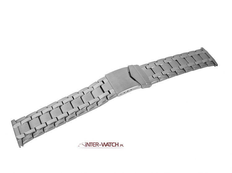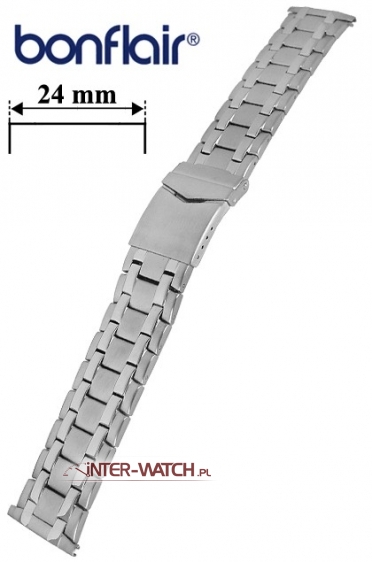 Bransoleta Bonflair do zegarka, kuta solidna bransoleta do męskiego zegarka wykonana ze stali. Klasyczna bransoleta do zegarka szerokości 24,0 mm przy kopercie. Bransoletę można dopasować - zwężać do dowolnej szerokości w zakresie od 21 do 2240 mm. Zamek standardowy z dodatkowym zabezpieczeniem, bransoleta ozdobnie polerowana i matowana na całej długości, pełne ogniwa, boczne powierzchnie ogniw jednolite, możliwa regulacja długości bransolety poprzez regulację zamka lub skracanie.