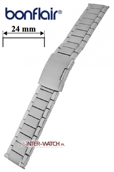 Bransoleta do zegarka 24 mm Bonflair, uniwersalna bransoleta do zegarka wykonana ze stali. Klasyczna bransoleta do zegarka 24,00 mm przy kopercie. Bransoletę można dopasować - zwężać mechanicznie do szerokości 22,00 mm. Zamek boczny, ozdobnie polerowana i matowana na całej długości, ogniwa pełne -kryte z boku, możliwa regulacja - skracanie lub wydłużanie długości bransolety poprzez regulacje zamka i usuwanie lub dokładanie ogniw.