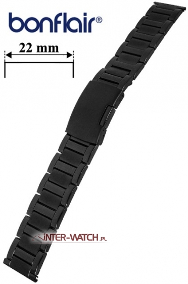 Bransoleta do zegarka 22 mm Bonflair, uniwersalna bransoleta do zegarka wykonana ze stali. Klasyczna bransoleta do zegarka 22,00 mm przy kopercie. Bransoletę można dopasować - zwężać do szerokości 20,00 mm. Zamek boczny, bransoleta pokryta powłoką IP w kolorze czarnym, powłoka trwała i efektowna, bransoleta ozdobnie polerowana i matowana na całej długości, ogniwa pełne -kryte z boku, możliwa regulacja - skracanie lub wydłużanie długości bransolety poprzez regulacje zamka i usuwanie lub dokładanie ogniw.