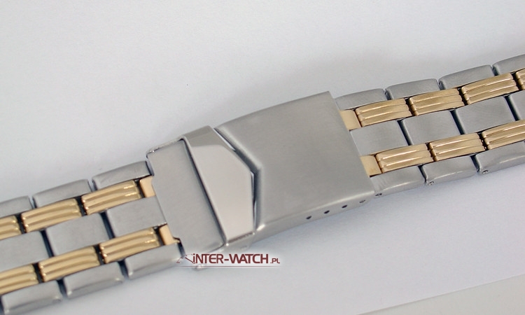 Bransoleta do zegarka Bonflair, standardowa solidna bransoleta do męskiego zegarka wykonana ze stali. Klasyczna bransoleta do zegarka szerokości 20,0 mm przy kopercie. Bransoletę można dopasować - zwężać do dowolnej szerokości w zakresie od 20 do 18,0 mm. Zamek standardowy z dodatkowym zabezpieczeniem, bransoleta częściowo złocona PVD oraz ozdobnie polerowana i matowana na całej długości, możliwa regulacja długości bransolety poprzez regulację zamka lub skracanie.