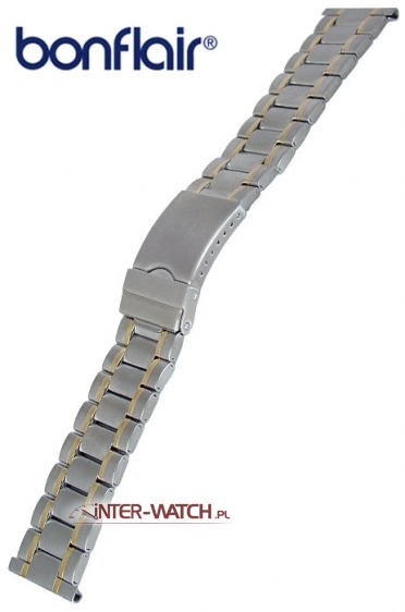 Bransoleta do zegarka Bonflair, standardowa solidna bransoleta do męskiego zegarka wykonana ze stali. Klasyczna bransoleta do zegarka szerokości 24,0 mm przy kopercie. Bransoletę można dopasować - zwężać do dowolnej szerokości w zakresie od 20 do 24,0 mm. Zamek standardowy z dodatkowym zabezpieczeniem, bransoleta częsciowo złocona PVD oraz ozdobnie polerowana i matowana na całej długości, możliwa regulacja długości bransolety poprzez regulację zamka lub skracanie.
