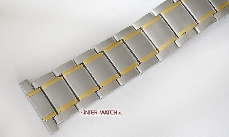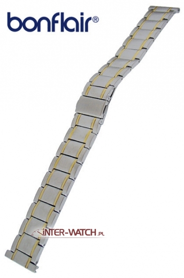 Bransoleta do zegarka Bonflair standardowa solidna bransoleta do męskiego zegarka wykonana ze stali 316L. Klasyczna bransoleta do zegarka szerokości 22,0 mm przy kopercie. Bransoletę można dopasować - zwężać do dowolnej szerokości w zakresie od 22 do 18,0 mm. Zamek kryty skrzydełkowy krótki, pełne kute ogniwa bransolety częściowo złocone PVD oraz ozdobnie polerowane i matowane na całej długości, możliwa regulacja długości bransolety poprzez skracanie.