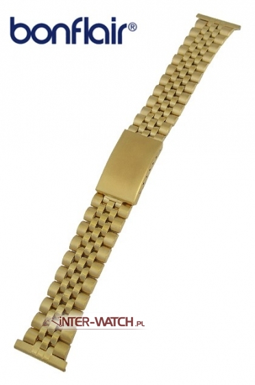 Pozłacana powierzchniowo bransoleta do zegarka Bonflair, standardowa solidna bransoleta do męskiego zegarka wykonana ze stali. Klasyczna bransoleta do zegarka szerokości 22,0 mm przy kopercie. Bransoletę można dopasować - zwężać do dowolnej szerokości w zakresie od 18 do 22,0 mm. Zamek standardowy, bransoleta ozdobnie polerowana i matowana na całej długości, możliwa regulacja długości bransolety poprzez regulację zamka lub skracanie.