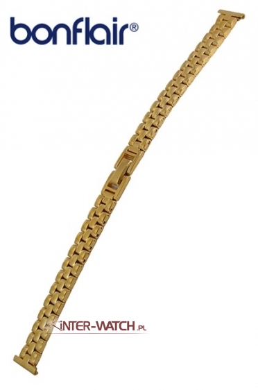 Bransoleta do zegarka Bonflair, złocona bransoleta do damskiego zegarka wykonana ze stali. Dwuczęściowa bransoleta do zegarka szerokości 12 mm przy kopercie. Bransoletę można dopasować - zwężać mechanicznie do szerokości 8 mm przy kopercie. Zamek standardowy, bransoleta złocona PVD oraz ozdobnie polerowana i matowana na całej długości, możliwa regulacja - skracanie lub wydłużanie długości bransolety poprzez regulacje zamka oraz usuwanie lub dokładanie ogniw.