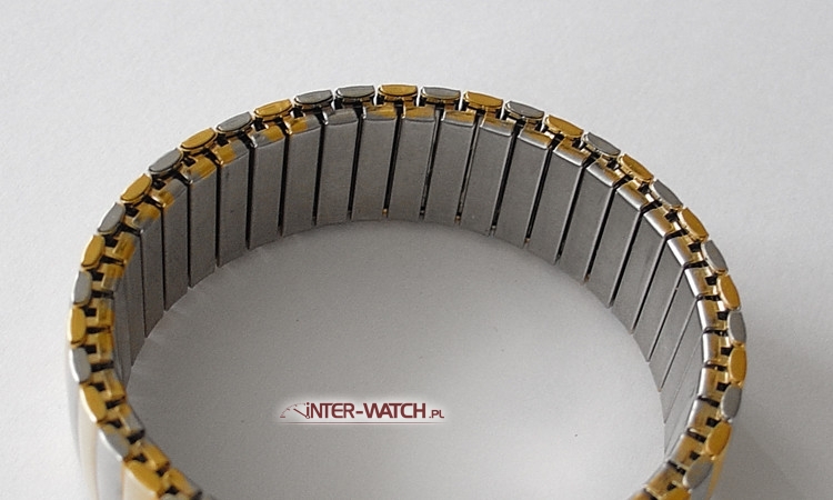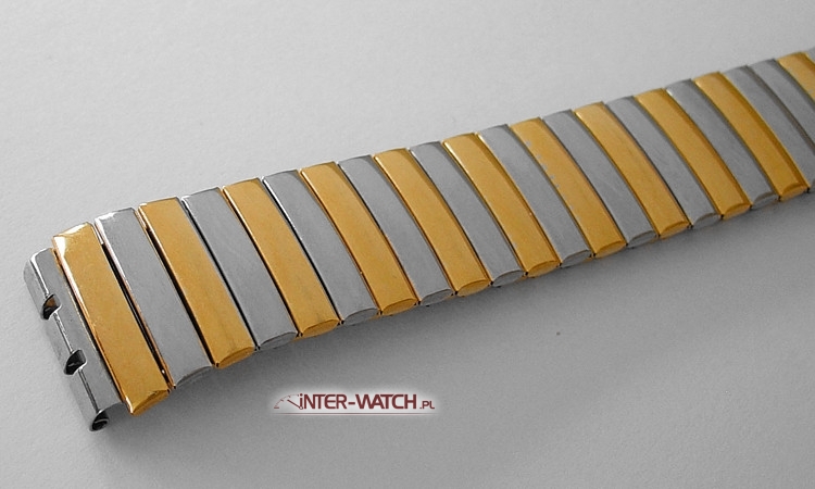 Bransoleta Bonflex do zegarka Swatch 17,0 mm zamiennik. Rozciągana jednoczęściowa bransoleta pasująca do zegarka Swatch. Bardzo trwała i solidna konstrukcja bransolety w której zostosowano klamry skrętne jako elementy elastyczne. Bransoleta nie "szczypie" nadgarstka podczas użytkowania. Powierzchnia bransolety częściowo złocona PVD  Bi-Color oraz ozdobnie polerowana. Możliwość skracania i wydłużania bransolety.