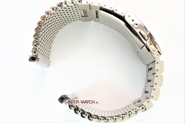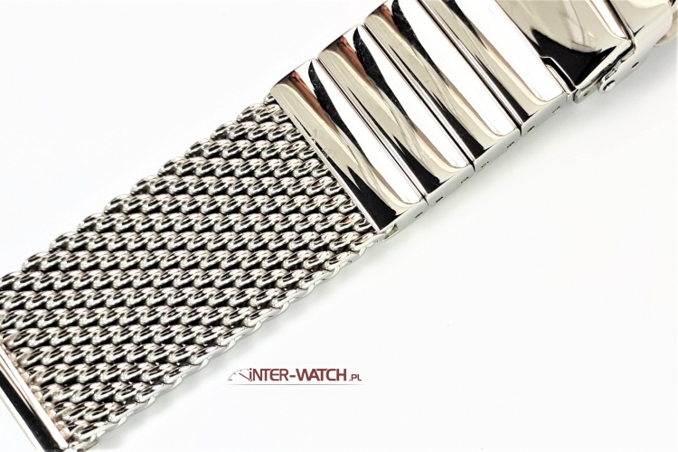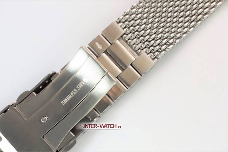 Bransoleta do zegarka 22 mm Bonflair 201964, stalowa bransoleta 22 mm typu Mesh do zegarka, standardowa solidna bransoleta do męskiego zegarka wykonana ze stalowej plecionki-siatki łączona z pełnymi ogniwami bransolety. Zamek z dodatkowym zabezpieczeniem, bransoleta ozdobnie polerowana na całej długości, możliwa regulacja długości bransolety poprzez regouację zamka.