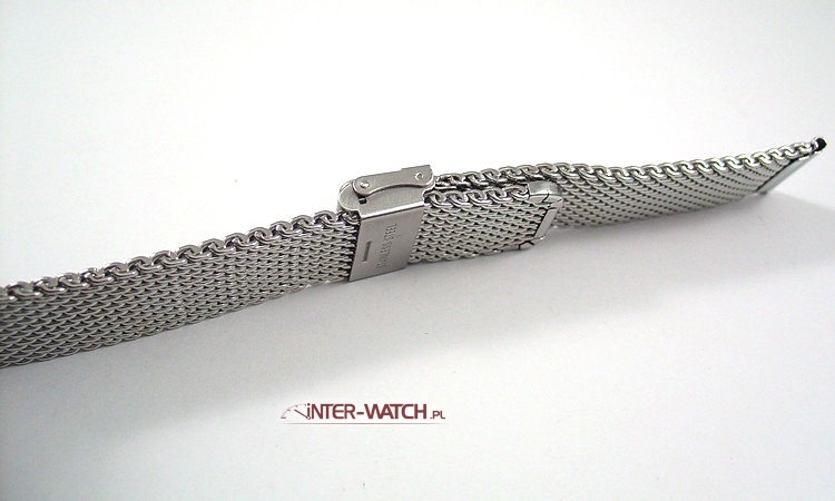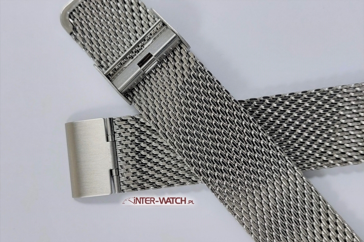 Bransoleta do zegarka 22 mm Bonflair 203350, stalowa bransoleta typu Mesh 22 mm, standardowa solidna bransoleta do męskiego zegarka wykonana z grubej stalowej plecionki-siatki. Klasyczna bransoleta do zegarka szerokości 22 mm przy kopercie. Zamek standardowy z dodatkowym zabezpieczeniem, bransoleta matowana na całej długości, możliwa regulacja długości bransolety poprzez przesuwanie zamka.