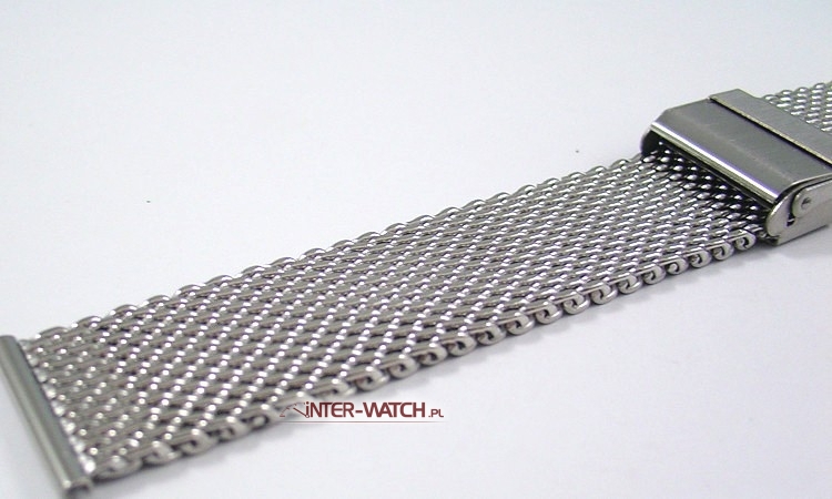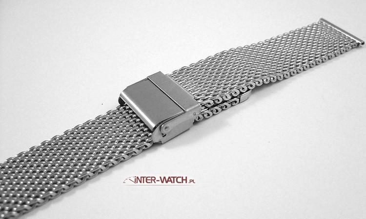 Bransoleta do zegarka 24 mm Bonflair 203351, stalowa bransoleta typu Mesh 24 mm, standardowa solidna bransoleta do męskiego zegarka wykonana z grubej stalowej plecionki-siatki. Klasyczna bransoleta do zegarka szerokości 24 mm przy kopercie. Zamek standardowy z dodatkowym zabezpieczeniem, bransoleta matowana na całej długości, możliwa regulacja długości bransolety poprzez przesuwanie zamka.