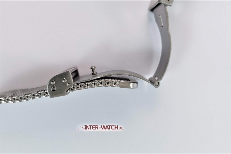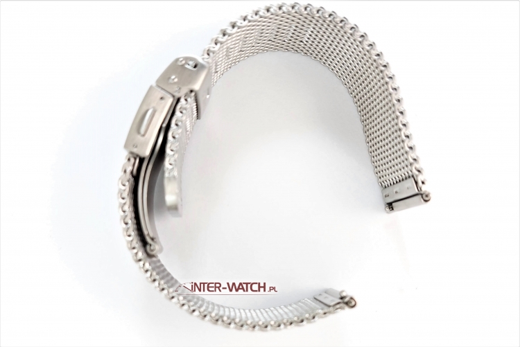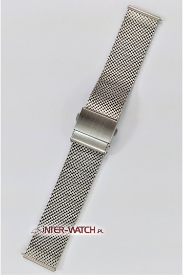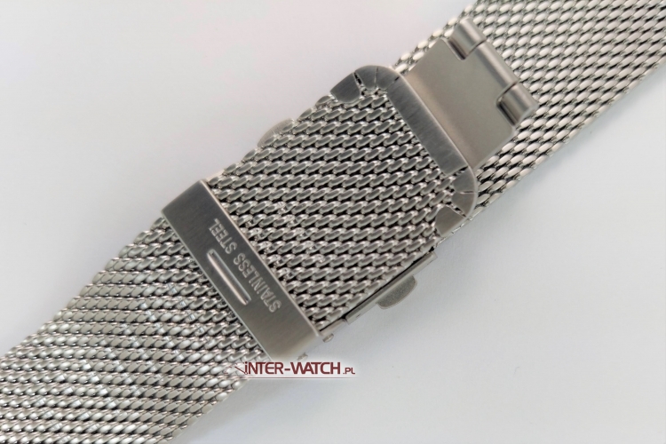 Bransoleta do zegarka 20 mm Bonflair 203449 stalowa bransoleta typu Mesh 20 mm, standardowa solidna bransoleta do męskiego zegarka wykonana z grubej stalowej plecionki-siatki. Klasyczna bransoleta do zegarka szerokości 20 mm przy kopercie. Zamek standardowy z dodatkowym zabezpieczeniem, bransoleta matowana na całej długości, możliwa regulacja długości bransolety poprzez przesuwanie zamka.