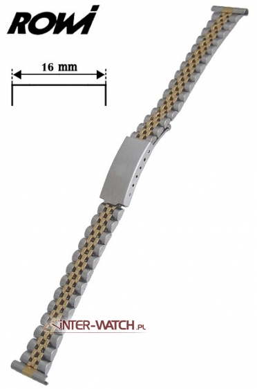 Bransoleta Rowi 302688 do zegarka, klasyczna bransoleta do zegarka damskiego wykonana ze stali 316L. Jednoczęściowa bransoleta do zegarka szerokości 16 mm przy kopercie, bransoletę można dopasować - zwężać do szerokości 12 mm. Zamek standardowy, ogniwa bransolety standardowe, bransoleta częściowo złocona PVD oraz ozdobnie polerowana i matowana na całej długości, możliwa regulacja - skracanie lub wydłużanie bransolety poprzez regulację zamka oraz usuwanie lub dokładanie ogniw bransolety.