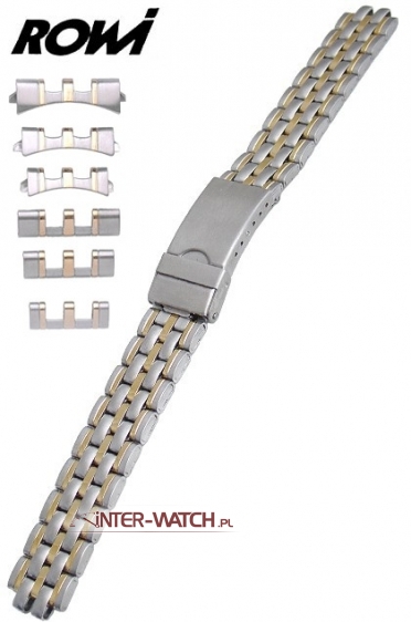 Bransoleta do zegarka ROWI Multiend, uniwersalna bransoleta do zegarka wykonana ze stali. Jednoczęściowa bransoleta do zegarka szerokości 14, 16 lub 18,00 mm przy kopercie. Bransoleta wyposażona w uniwersalne końcówki umożliwjające mocowanie do kopert o różnych kształtach i szerokościach. Bransoletę można dopasować - zwężać do szerokości 14,00 mm. Zamek standardowy z dodatkowym zabezpieczeniem, ogniwa bransolety standardowe, bransoleta częściowo złocona PVD oraz ozdobnie polerowana i matowana na całej długości, możliwa regulacja - skracanie lub wydłużanie długości bransolety poprzez regulację zamka oraz usuwanie lub dokładanie ogniw bransolety.