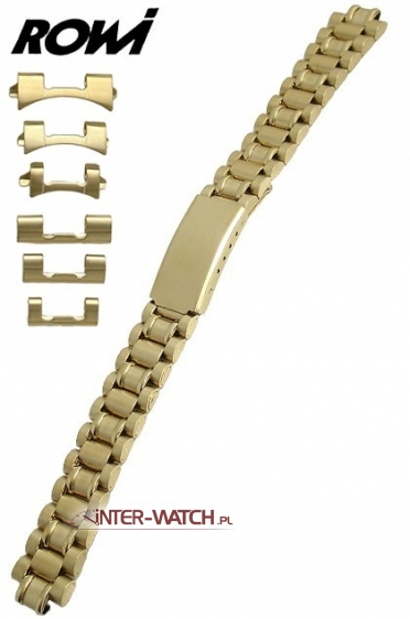 Bransoleta do zegarka ROWI Multiend, uniwersalna bransoleta do zegarka wykonana ze stali. Jednoczęściowa bransoleta do zegarka szerokości 12, 14 lub 16,00 mm przy kopercie. Bransoleta wyposażona w uniwersalne końcówki umożliwjające mocowanie do kopert o różnych kształtach i szerokościach. Bransoletę można dopasować - zwężać do szerokości 12,00 mm. Zamek standardowy z dodatkowym zabezpieczeniem, ogniwa bransolety standardowe, bransoleta złocona PVD oraz ozdobnie polerowana i matowana na całej długości, możliwa regulacja - skracanie lub wydłużanie długości bransolety poprzez regulację zamka oraz usuwanie lub dokładanie ogniw bransolety.