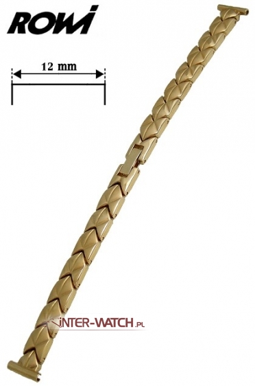 Bransoleta do zegarka niemieckiej firmy ROWI, ozdobna bransoleta do zegarka damskiego wykonana ze stali. Klasyczna bransoleta do zegarka szerokości 12,00 mm przy kopercie, bransoletę można dopasować - zwężać do szerokości 9,00 mm. Zamek standardowy, pełne ogniwa bransolety, bransoleta złocona PVD oraz ozdobnie polerowana i matowana na całej długości, możliwa regulacja - skracanie lub wydłużanie bransolety poprzez usuwanie lub dokładanie ogniw bransolety.