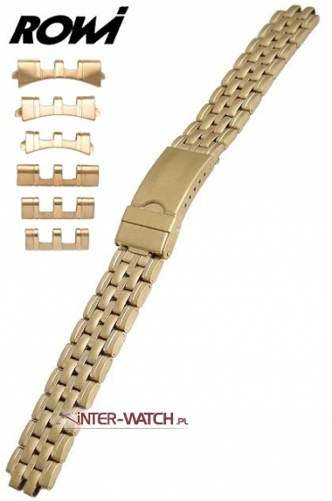 Bransoleta do zegarka ROWI Multiend, uniwersalna bransoleta do zegarka wykonana ze stali. Jednoczęściowa bransoleta do zegarka szerokości 14, 16 lub 18 mm przy kopercie. Bransoleta wyposażona w uniwersalne końcówki umożliwjające mocowanie do kopert o różnych kształtach i szerokościach. Bransoletę można dopasować - zwężać do szerokości 14 mm. Zamek standardowy z dodatkowym zabezpieczeniem, ogniwa bransolety standardowe, bransoleta złocona PVD oraz ozdobnie polerowana i matowana na całej długości, możliwa regulacja - skracanie lub wydłużanie długości bransolety poprzez regulację zamka oraz usuwanie lub dokładanie ogniw bransolety.