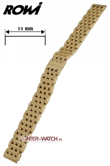 Bransoleta do zegarka niemieckiej firmy ROWI, ozdobna bransoleta do zegarka damskiego wykonana ze stali. Jednoczęściowa bransoleta do zegarka szerokości 14,00 mm przy kopercie. Zamek kryty, pełne-kute ogniwa bransolety, bransoleta złocona PVD oraz ozdobnie polerowana na całej długości, możliwa regulacja - skracanie lub wydłużanie bransolety poprzez usuwanie lub dokładanie ogniw bransolety.
