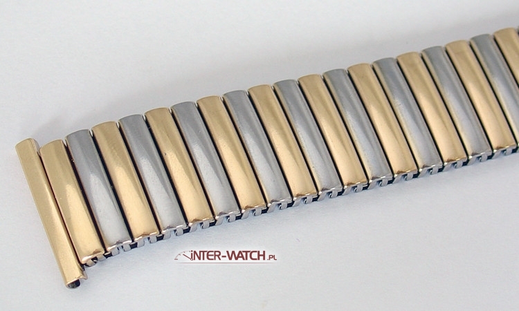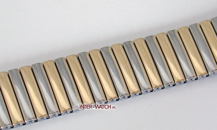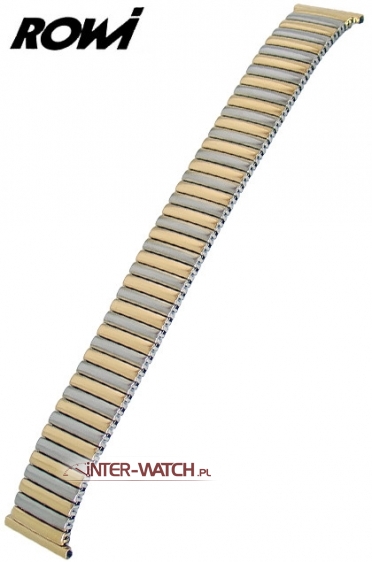 Bransoleta do zegarka niemieckiej firmy ROWI. Elastyczna bransoleta do męskiego zegarka wykonana ze stali. Jednoczęściowa bransoleta do zegarka o szerokości 22,0 mm przy kopercie z możliwością dopasowania-zwężenia do 18,0 mm. Bardzo trwała i solidna konstrukcja bransolety w której zostosowano klamry skrętne jako elementy elastyczne. Bransoleta nie "szczypie" nadgarstka podczas użytkowania. Powierzchnia bransolety złocona na przemian PVD Bi-Color oraz ozdobnie polerowana. Możliwość skracania i wydłużania bransolety.