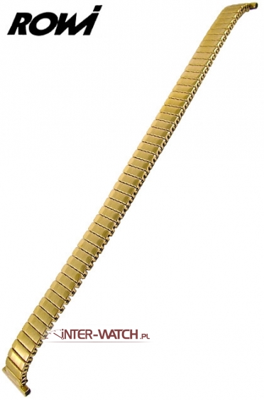 Bransoleta Rowi 385005, elastyczna bransoleta do damskiego zegarka wykonana ze stali złocona. Jednoczęściowa bransoleta do zegarka o szerokości 12,0 mm przy kopercie z możliwością dopasowania-zwężenia do 8,0 mm. Bardzo trwała i solidna konstrukcja bransolety w której zostosowano klamry skrętne jako elementy elastyczne. Bransoleta nie "szczypie" nadgarstka podczas użytkowania i rozciąga sie do długości 220,0 mm. Powierzchnia bransolety złocona PVD ozdobnie matowana i polerowana. Możliwość skracania i wydłużania bransolety.