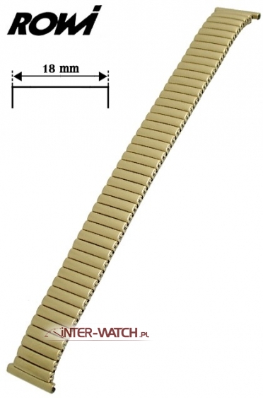 Bransoleta do zegarka niemieckiej firmy ROWI. Elastyczna bransoleta do męskiego zegarka wykonana ze stali. Jednoczęściowa bransoleta do zegarka o szerokości 18,0 mm przy kopercie z możliwością dopasowania-zwężenia do 14,0 mm. Bardzo trwała i solidna konstrukcja bransolety w której zostosowano klamry skrętne jako elementy elastyczne. Bransoleta nie "szczypie" nadgarstka podczas użytkowania. Powierzchnia bransolety złocona PVD ozdobnie polerowana i matowana. Możliwość skracania i wydłużania bransolety.