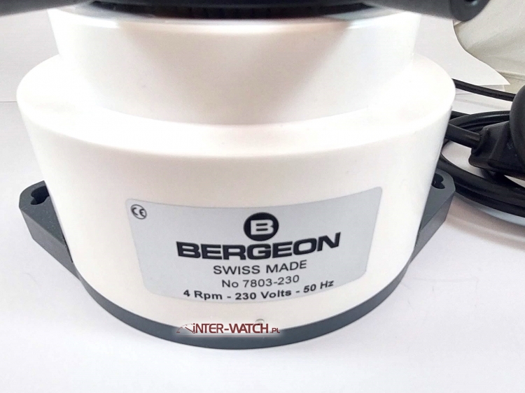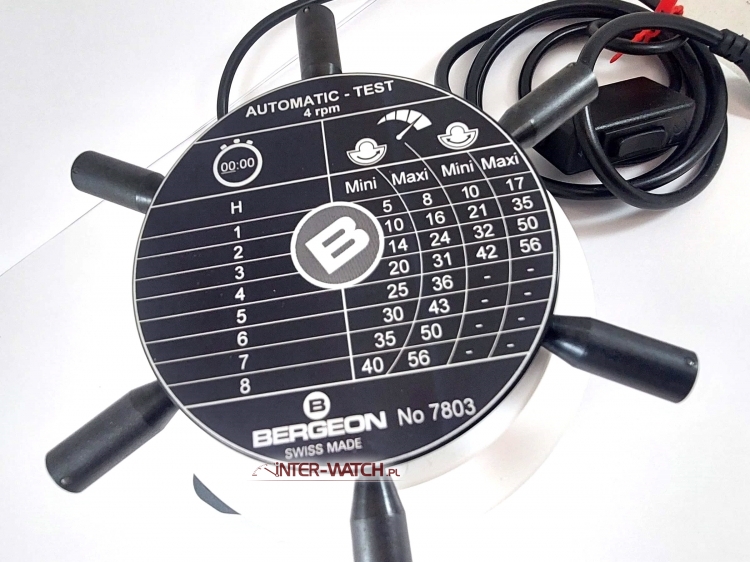 Bergeon Cyklomat 7803-230 to precyzyjne urządzenie służące do testowania mechanizmów automatycznych zegarków. Dzięki swojej konstrukcji, może pomieścić do 6 zegarków jednocześnie, co pozwala na efektywne testowanie większej liczby mechanizmów w krótszym czasie. Urządzenie obraca zegarki z prędkością 4 obrotów na minutę, co symuluje naturalne noszenie zegarka na nadgarstku, umożliwiając dokładną ocenę działania mechanizmu.