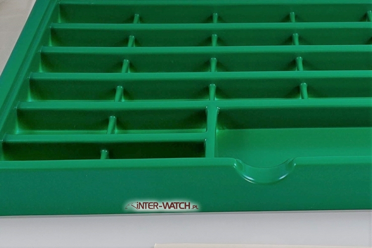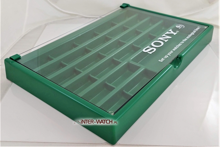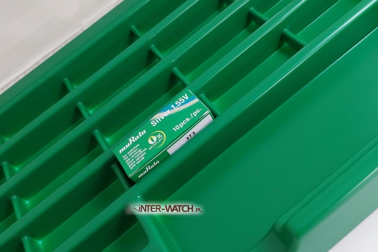 Pudełko zawiera 24 przegródek wielkości opakowania/10sz/baterii i jedną wiekszą przegródkę na narzedzia zegarmistrzowskie.