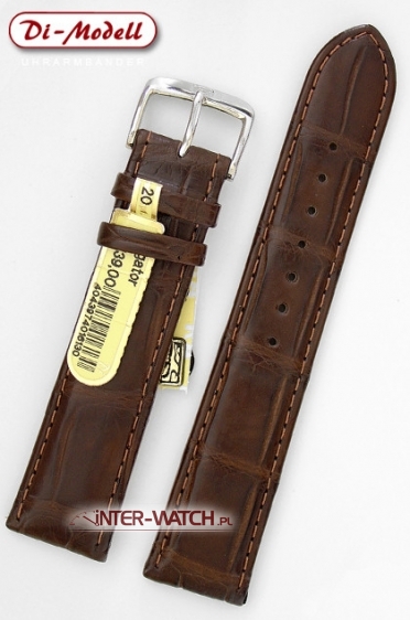 Pasek do zegarka 20 mm, pasek Di-Modell Alligator Louisiana 1600.2820 szerokości 20 mm przy kopercie, kolor No.28 - brązowy luksusowy pasek do zegarka 18 mm Di-Modell Alligator Louisiana z ekskluzywnej kolekcji Noble House. Egzotyczny pasek do zegarka wykonany ręcznie z prawdziwej skóry Alligatora z Louizjany. Do wykonania tego paska do zegarka wykorzystano specjalnie selekcjonowaną skórę Aligatora. Zastosowano patentowy system Areo-Futter który zapobiega akumulowaniu się wilgoci wewnątrz paska co przedłuża jego żywotność oraz poprawia komfort użytkowania, oraz patentowe zabezpieczenie przed przesuwanien się szlufki. Pasek do zegarka Di-Modell Alligator jest estetyczny, trwały a jednocześnie miękki i bardzo wygodny w użytkowaniu. Pasek do zegarka przeszywany na całej długości i wykańczany po bokach ozdobnym szwem. Dodatkowo pasek jest specjalnie pogrubiany na 1 / 3 długości. Szerokość paska nieznacznie zwężana na długości przy klamerce do 18 mm. Klamerka stalowa - sygnowana, stalowa lub złocona do wyboru. Pasek Di-Modell Alligator to ekskluzywny i elegancki pasek do zegarka dostępny w długości standardowej L oraz LXL. Prosimy o dokładne sprawdzenie szerokości mocowania paska przy kopercie zegarka oraz długości całkowitej paska. Oferujemy brązowy pasek 20 mm do zegarka wykonany z przwdziwej skóry Aligatora.