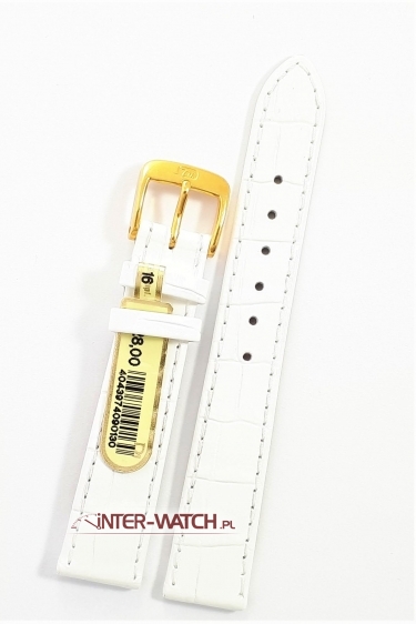 Pasek do zegarka 16 mm, pasek Di-Modell Bali 2180.1416 szerokości 16 mm przy kopercie, kolor No.14 - biały, krótki pasek do zegarka 16 mm szerokości rozmiar S. Pasek Di-Modell Bali 16 mm to pasek do zegarka wykonany ręcznie z naturalnej skóry cielęcej najwyższej jakości, na pasku jest trwale tłoczona faktura skóry Aligatora. Pasek do zegarka Di-Modell Bali jest estetyczny, mocny a jednocześnie miękki i bardzo wygodny w użytkowaniu. Przeszywany na całej długości, dodatkowo zastosowano patentowe zabezpieczenie przed przesuwanien sie szluflki. Szerokość paska nieznacznie zwężana na długości przy klamerce do 14 mm. Klamerka stalowa - sygnowana, stalowa lub złocona do wyboru. Pasek Di-Modell Bali to klasyczny i elegancki pasek do zegarka 16 mm o bardzo wysokich walorach użytkowych. Prosimy o dokładne sprawdzenie szerokości mocowania paska przy kopercie zegarka oraz długości całkowitej paska. Oferujemy najlepsze paski Di-Modell 16 mm do zegarków różnych marek.