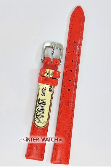 Pasek do zegarka 12 mm, pasek Di-Modell Tivoli 2155.0712 szerokości 12 mm przy kopercie, kolor No.07 - czerwony pasek do zegarka 12 mm. Wysokiej jakości skórzany pasek do zegarka 12 mm wykonany ręcznie z naturalnej skóry cielęcej najwyższej jakości, trwale tłoczona faktura skóry Strusia. Pasek Di-Modell Tivoli to antyalergiczny, trwały a jednocześnie miękki i bardzo wygodny w użytkowaniu. Przeszywany na całej długości i lekko pogrubiany. Szerokość paska nieznacznie zwężana na długości przy klamerce do 10 mm. Klamerka stalowa - sygnowana, stalowa lub złocona do wyboru. Pasek Di-Modell Tivoli to klasyczny pasek do zegarka o bardzo dobrych cechach użytkowych, dostępny tylko w długościach standardowych S i L. Prosimy o dokładne sprawdzenie szerokości mocowania paska przy kopercie zegarka oraz długości całkowitej paska. Oferujemy najlepsze paski Di-Modell 12 mm do zegarków różnych marek.