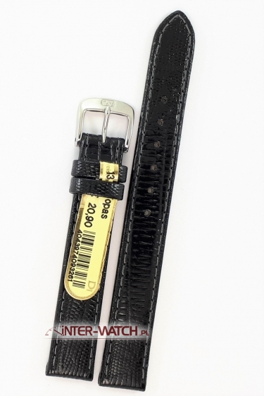 Pasek Di-Modell do zegarka 13 mm, pasek Di-Modell Topas 2160.1013 szerokości 13 mm przy kopercie, kolor No.10 - czarny pasek 13 mm do zegarka damskiego. Wysokiej jakości pasek do zegarka z wzorek Jaszczurki Teju. Pasek Di-Modell Topas to pasek do zegarka wykonany ręcznie z naturalnej skóry cielęcej najwyższej jakości, na pasku jest trwale tłoczona faktura skóry Jaszczurki Teju. Pasek Di-Modell Topas jest estetyczny, mocny a jednocześnie miękki i bardzo wygodny w użytkowaniu. pasek do zegarka przeszywany na całej długości, szerokość paska nieznacznie zwężana na długości przy klamerce do 12 mm. Klamerka stalowa - sygnowana, stalowa lub złocona do wyboru. Pasek Di-Modell Topas to klasyczny i elegancki pasek do zegarka o bardzo wysokich walorach użytkowych, dostępny w długościach standardowych S oraz SXL. Prosimy o dokładne sprawdzenie szerokości mocowania paska przy kopercie zegarka oraz długości całkowitej paska. Polecamy czarny pasek Di-modell do zegarka 13 mm dobrze wykonany.