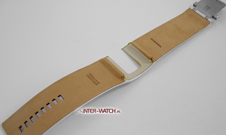 Biały pasek Diesel DZ-7054, szeroki jednoczęściowy pasek do zegarka Diesel DZ-7054 przeszywany na wierzchu z lewej strony, zamek stalowy sygnowany logo Diesel. Zegarek mocowany pod paskiem. Pasek do zegarka dedykowany wyłacznie do modeli zegarków Diesel :