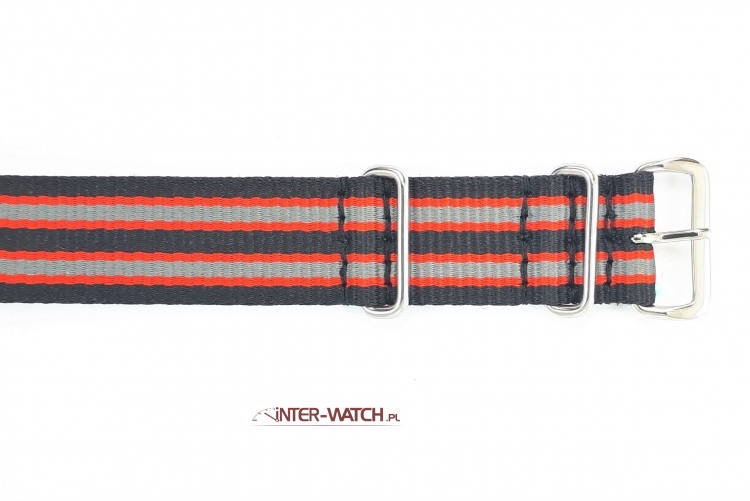 Oferujemy nylonowy pasek NATO 18 mm czarno -czerwono- popielato do zegarka, polecamy dobry pasek do zegarka 18 mm wykonany z nylonowej taśmy wysokiej jakości. Klamerka i szlufki stalowe, zakuwane dla uzyskania odpowiedniej wytrzymałości.