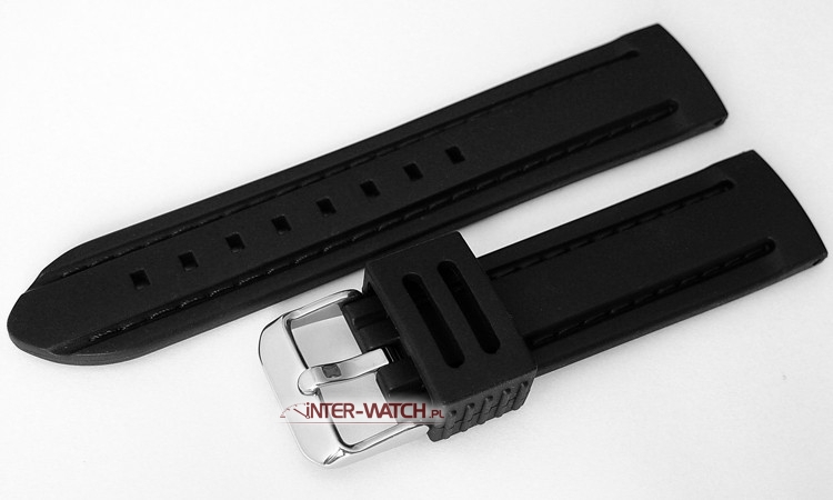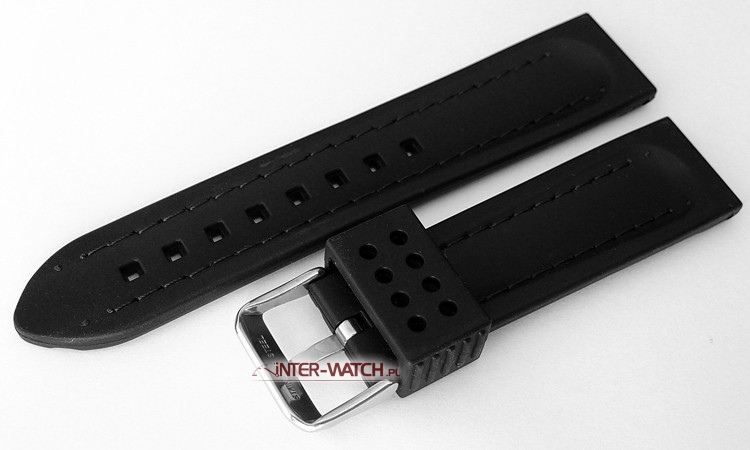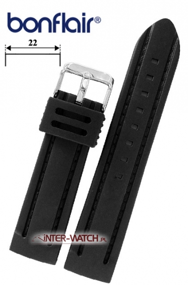 Silikonowy pasek do zegarka 22 mm Bonflair, trwały pasek do zegarka wykonany z silikonu przeszywany czarną nicią. Oferujemy dobry pasek do zegarka 22 mm silikonowy, z klasycznym mocowaniem przy kopercie 22 mm, zwężany do 20 mm przy klamerce, klamerka stalowa. Pasek z wierzchu i od spodu przetłacvzany - nie „przykleja się” do nadgarstka, co podnosi komfort użytkowania tego paska. Pasek dedykowany do nowoczesnych modeli zegarków różnych marek jako pasek podstawowy lub zamiennik oryginalnego paska. Pasek nie powoduje reakcji alergologicznych – nie uczula i jest wygodny w użytkowaniu, miękki pasek do sportowego zegarka. Pasek odporny na działanie potu. Możliwe zastosowanie tego paska w prawie w każdym zegarku pod warunkiem dopasowania szerokości mocowania przy kopercie.