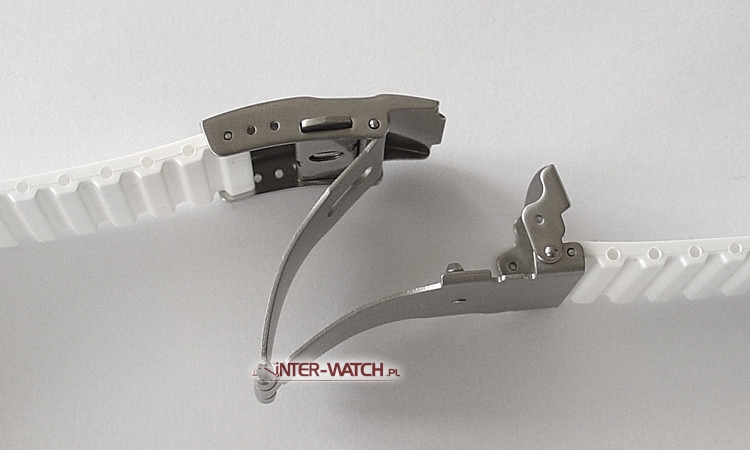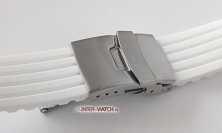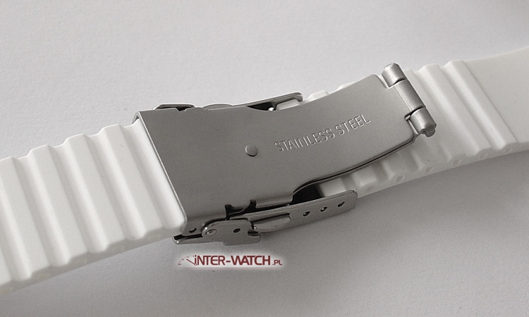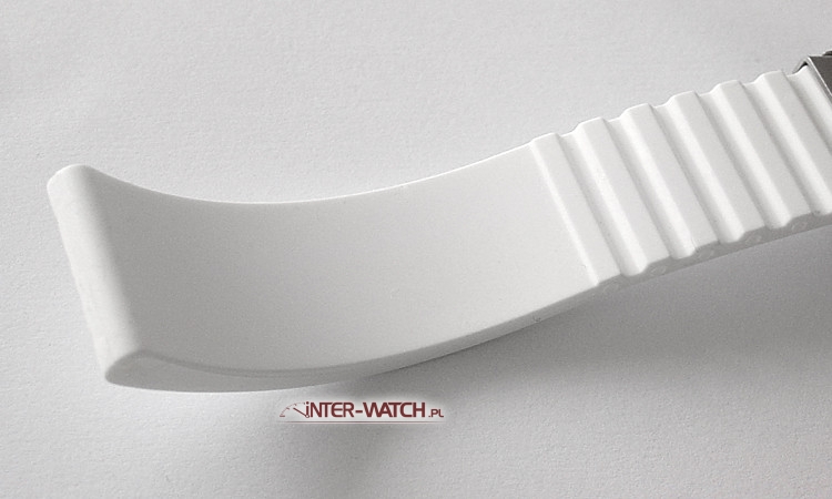 Silikonowy pasek do zegarka 22 mm marki Bonflair, trwa³y i wodoodporny pasek do sportowego zegarka. Wysokiej jako¶ci BIA£Y pasek do zegarka szeroko¶ci 22 mm przy kopercie, zamek skrzyde³kowy jak w bransolecie z dodatkowym zabezpieczeniem. Skracanie paska poprzez odcinanie elementów paska oraz regulacje na zamku. Miêkki i antyalergiczny pasek do zegarka wykonany z silikonu.