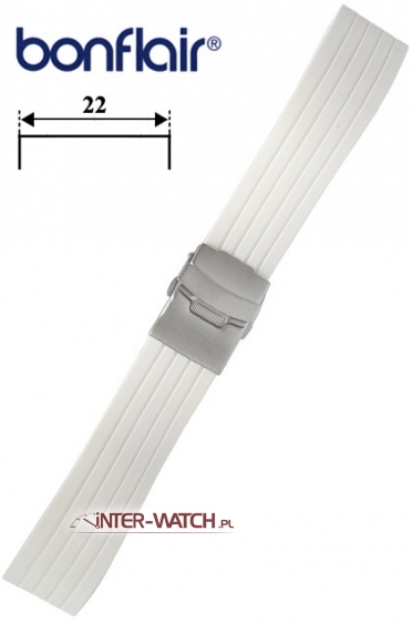 Silikonowy pasek do zegarka 22 mm marki Bonflair, trwa³y i wodoodporny pasek do sportowego zegarka. Wysokiej jako¶ci BIA£Y pasek do zegarka szeroko¶ci 22 mm przy kopercie, zamek skrzyde³kowy jak w bransolecie z dodatkowym zabezpieczeniem. Skracanie paska poprzez odcinanie elementów paska oraz regulacje na zamku. Miêkki i antyalergiczny pasek do zegarka wykonany z silikonu.