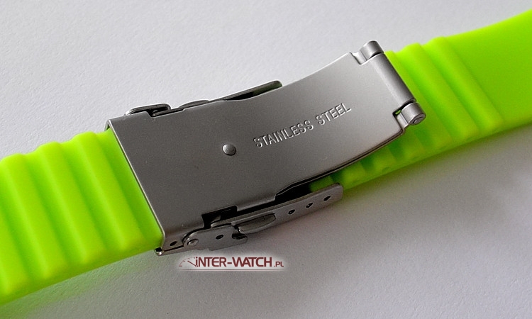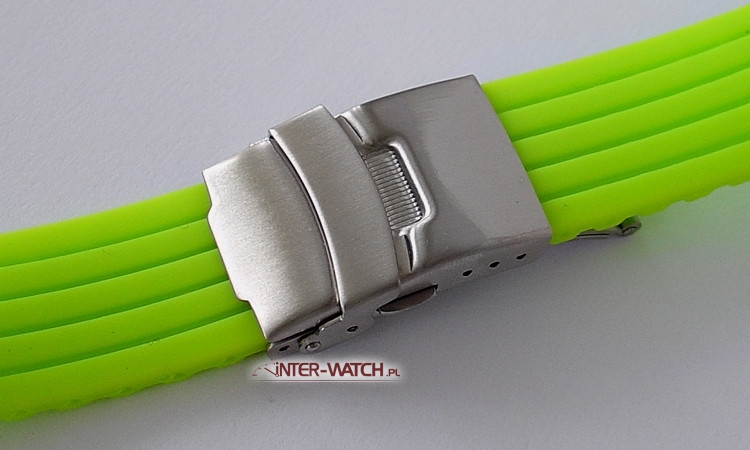 Silikonowy pasek do zegarka 22 mm marki Bonflair, trwały i wodoodporny pasek do sportowego zegarka. Wysokiej jakości SELEDYNOWY pasek do zegarka szerokości 22 mm przy kopercie, zamek skrzydełkowy jak w bransolecie z dodatkowym zabezpieczeniem. Skracanie paska poprzez odcinanie elementów paska oraz regulację na zamku. Miękki i antyalergiczny pasek do zegarka wykonany z silikonu.