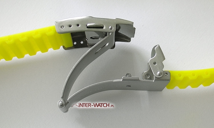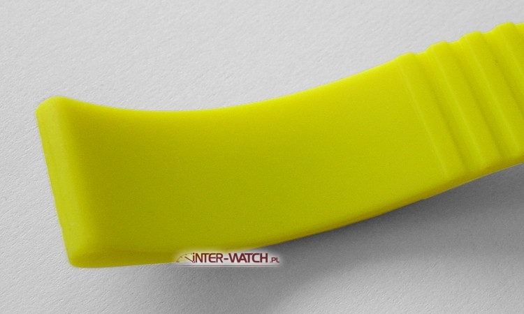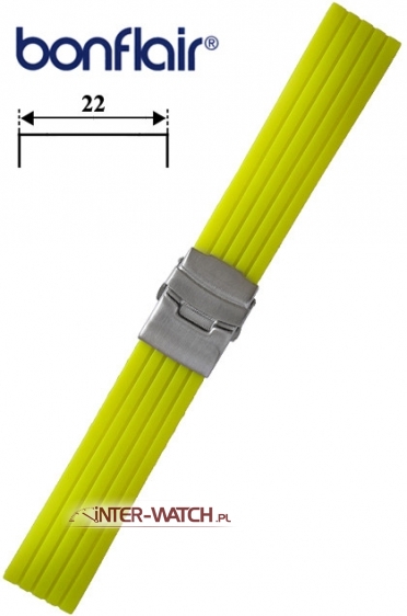 Silikonowy pasek do zegarka  22 mm marki Bonflair, trwały i wodoodporny pasek do sportowego zegarka. Wysokiej jakości ŻÓŁTY pasek do zegarka szerokości 22 mm przy kopercie, zamek skrzydełkowy jak w bransolecie z dodatkowym zabezpieczeniem. Skracanie paska poprzez odcinanie elementów paska oraz regulację na zamku. Miękki i antyalergiczny pasek do zegarka wykonany z silikonu.