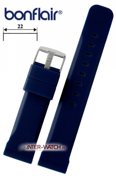 Silikonowy pasek do zegarka 22 mm Bonflair, niebieski pasek do zegarka 22 mm wykonany z silikonu. Oferujemy wysokiej jakości pasek do zegarka z klasycznym mocowaniem przy kopercie 22 mm, zwężany do 20 mm przy klamerce, klamerka stalowa. Pasek z wierzchu gładki - nie „przykleja się” do nadgarstka, co podnosi komfort użytkowania tego paska. Pasek dedykowany do nowoczesnych modeli zegarków różnych marek jako pasek podstawowy lub zamiennik oryginalnego paska. Pasek nie powoduje reakcji alergologicznych – nie uczula i jest wygodny w użytkowaniu. Pasek odporny na działanie potu. Możliwe zastosowanie tego paska w prawie w każdym zegarku pod warunkiem dopasowania szerokości mocowania przy kopercie