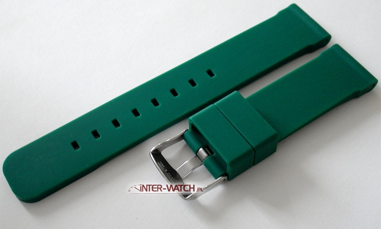 Silikonowy pasek do zegarka 22 mm, estetyczny zielony pasek do zegarka 22 mm wykonany z silikonu. Oferujemy wysokiej jakości pasek do zegarka z klasycznym mocowaniem przy kopercie 22 mm , zwężany do 20 mm przy klamerce, klamerka stalowa. Pasek z wierzchu gładki - nie „przykleja się” do nadgarstka, co podnosi komfort użytkowania tego paska. Pasek dedykowany do nowoczesnych modeli zegarków różnych marek jako pasek podstawowy lub zamiennik oryginalnego paska. Pasek nie powoduje reakcji alergologicznych – nie uczula i jest wygodny w użytkowaniu. Pasek odporny na działanie potu. Możliwe zastosowanie tego paska w prawie w każdym zegarku pod warunkiem dopasowania szerokości mocowania przy kopercie