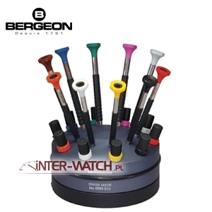 Śrubokręty precyzyjne zegarmistrzowskie BERGEON na obrotowej podstawie – szwajcarska jakość. Zestaw zawiera 10 śrubokrętów w rozmiarach od 0,5 mm do 3,0 mm.